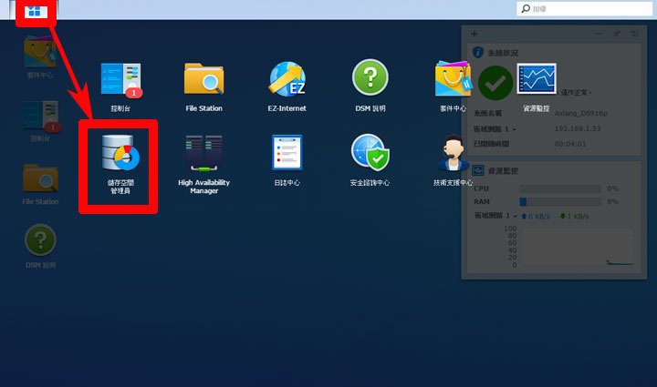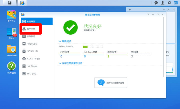 在完成了DSM系統的安裝後,其實我們安裝在DS916+的硬碟,還沒有進行初始化,需要透過「建立儲存空間」的方式,來完成硬碟儲存空間的佈署,讓我們真正可以開始在NAS中儲存檔案。