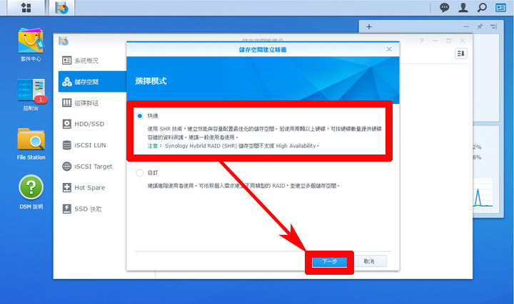 圖:接著會出現「儲存空間建立精靈」,我們可以選擇「快速」並按「下一步」來開始進行儲存空間的設定。
