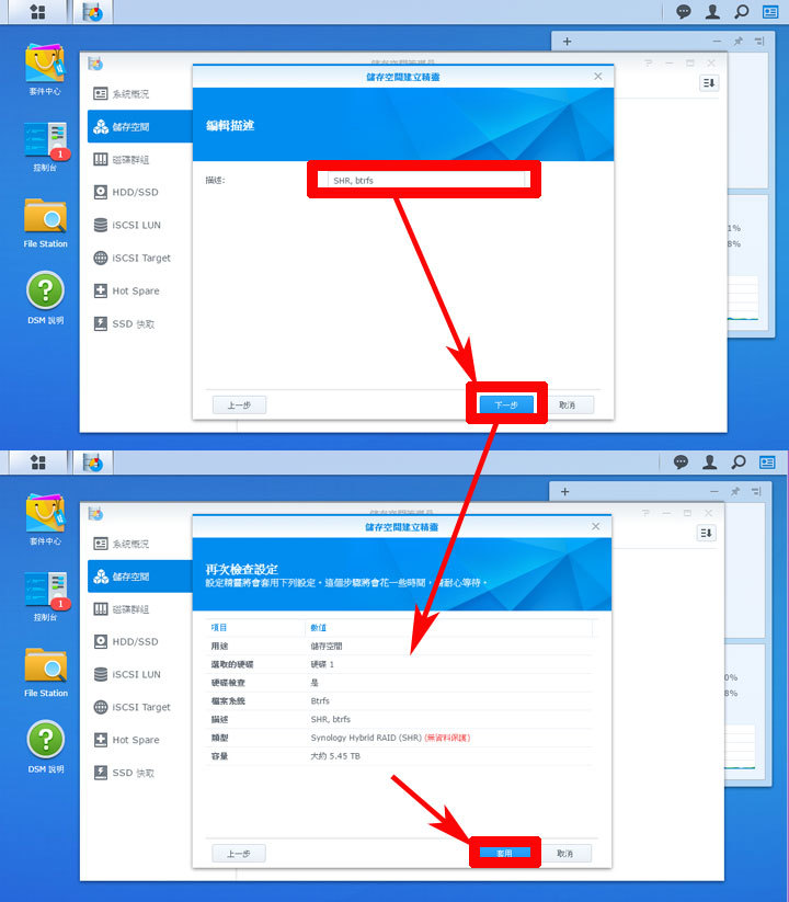 圖:接下來在「編輯描述」中可自定硬碟系統的說明,最後在「再次檢查設定」的頁面中,確認設定無誤後,按下「套用」即會開始進行硬碟空間建置的作業。