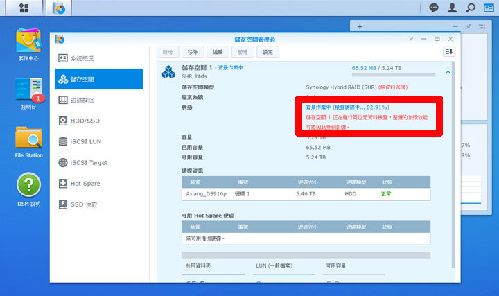 圖:硬碟空間的建置會自動以背景化的方式進行,依據使用硬碟容量的不同,所花費的時間也會有所差異。以評測使用的這顆6T容量的硬碟來說,會需要花好幾個小時的時間。