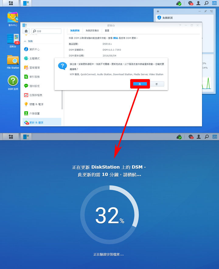 圖:下載完成後,在套用更新時會需要重新開機並保持DS916+在開機狀態,請按下「是」,讓系統自動重開機,並進行安裝更新的動作。