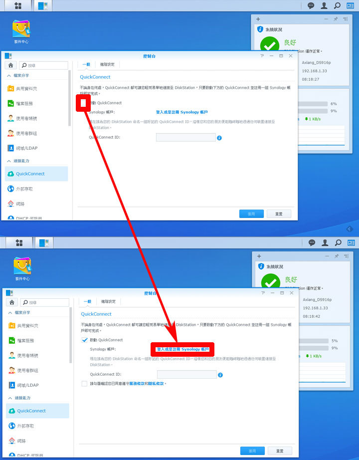 圖:勾選「啟動QuickConnect」的功能,接下來點選「登入或是註冊Synology帳戶」。