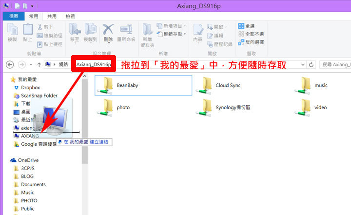 圖:為了方便我們日後的存取,我們可以直接拖拉上方網址列「DS916+路徑」的名稱到左方的「我的最愛」區,之後就可以直接點選來存取囉!