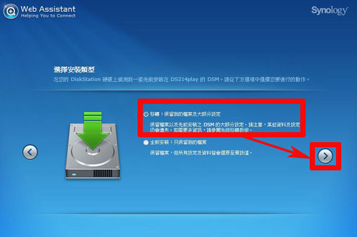 .直接將舊款主機上的硬碟安裝到新機:若是要將舊主機上的硬碟直接使用到新主機,可以選擇直接將舊款主機上的硬碟安裝到新主機上,並採用「移轉」的方式來重新安裝DSM系統。但要特別注意的是,這樣設定的方式,會讓系統部份的資料遺失,像是Photo Station的網誌內容、Video Station中的影片資訊、Mail Server與Mail Station、以及Surveillance Station的設定,另外Download Station未完成的下載任務與暫存資料也會被清除掉,但原本共用資料夾中的檔案,則不會受到影響。