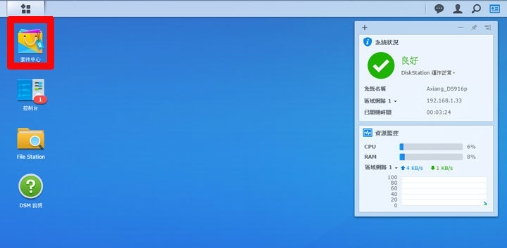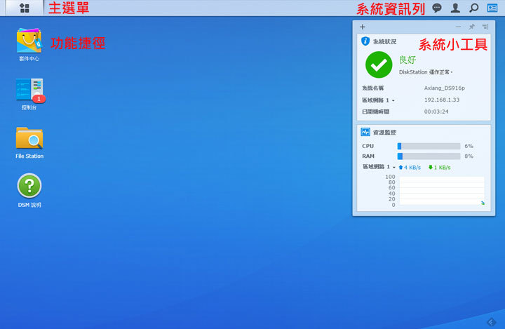 圖:來看看DSM系統的主畫面吧!在右上方有「主選單」按鈕,桌面上有預設的功能捷徑,右上方則是有系統資訊列,可以查看系統事件的資訊與個人設定,另外也會有顯示系統狀況和資源監控的小工具。