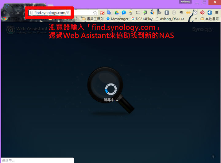 圖:在確認好DS916+已經連結到區域網路並開啟電源之後,我們可以利用同一區網的電腦,開啟瀏覽器,直接連入「find.synology.com」這個網址,開啟「Web Assistant」來進行新NAS的掃描。