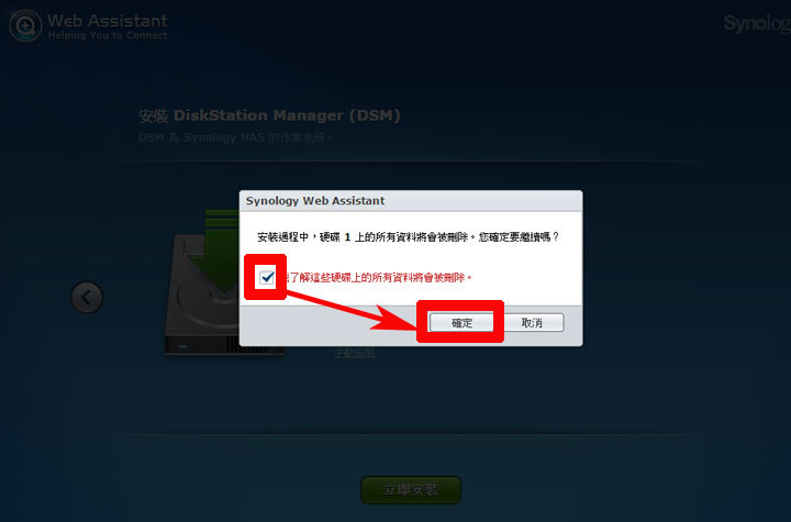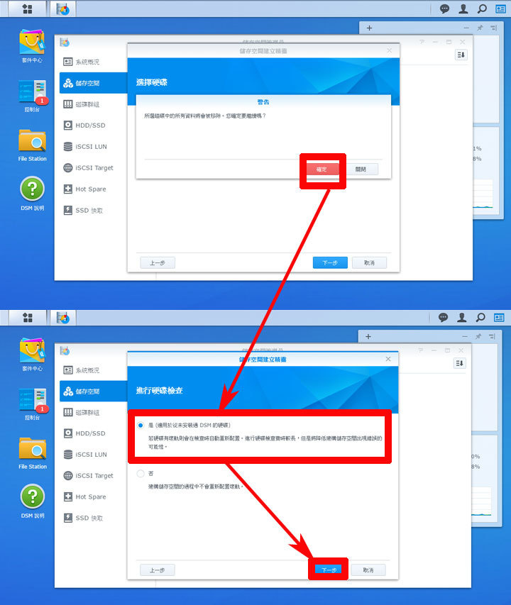 圖:接下來系統會出現硬碟資料移除的警告,請選擇「確定」,接下來在「進行硬碟檢查」中,選擇預設的「是(適用於從未安裝DSM的硬碟)」,並按「下一步」。