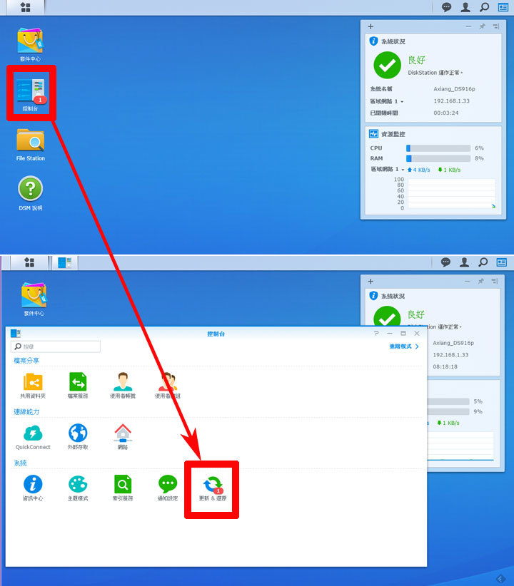 圖:當DSM系統有更新時,桌面上的「控制台」圖示上會有「紅色數字」來提示,進入控制台後,點選「更新 & 還原」可進入系統更新的相關功能。
