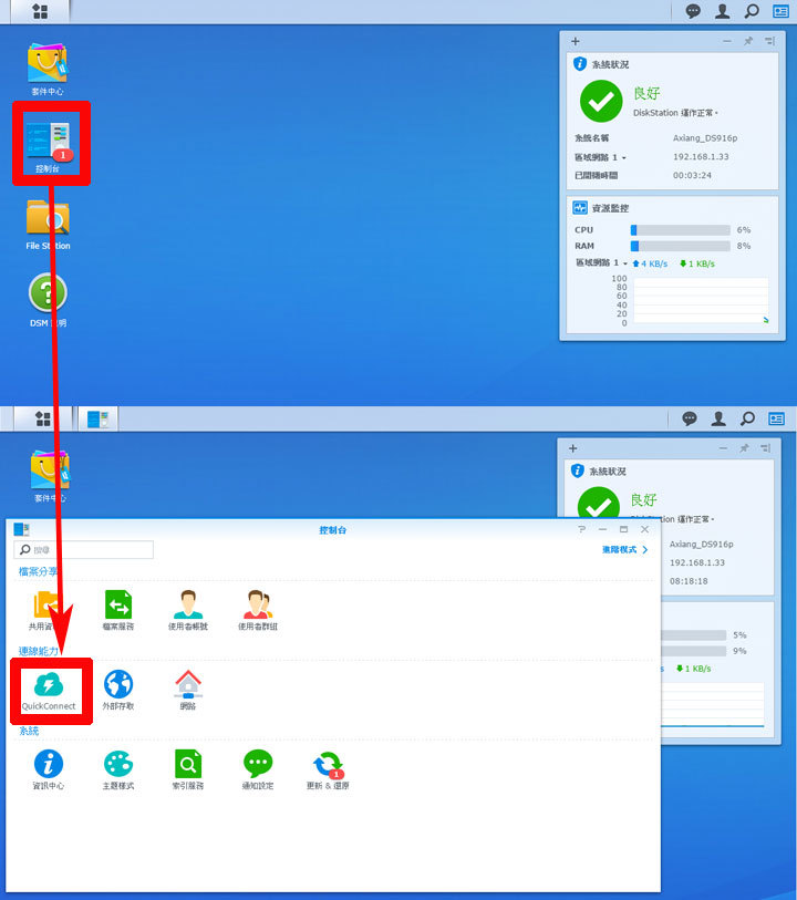 圖:點選「控制台」,並進入「QuickConnect」的選項。