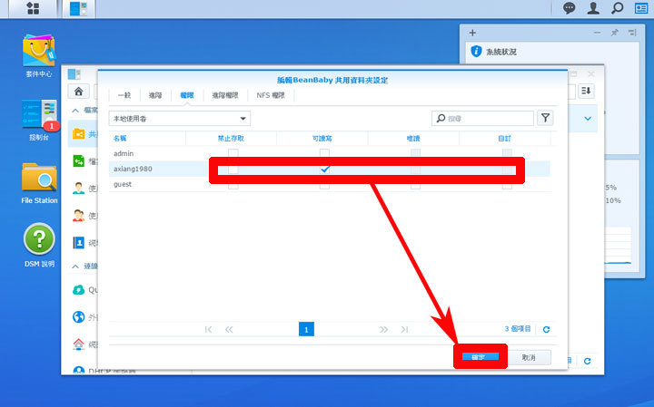 圖:接下來我們可以設定系統中各個帳號的存取權限,我們可以依照自己的需求,來決定不同帳號是否可以讀寫共用資料夾的內容,或是設定只能讀取,或是完全禁止存取,設定完成後,別忘了按下「確定」哦!