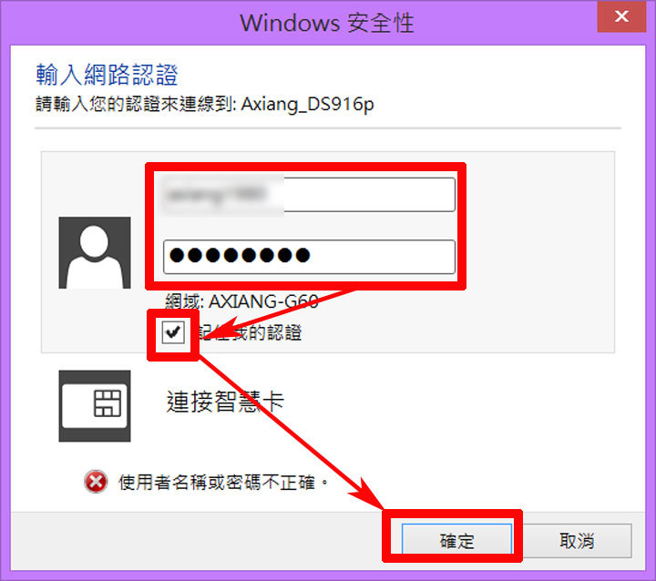 圖:由於我們有設置系統權限,因此會跳出網路認證視窗,我們可以輸入DSM系統的帳號與密碼,並將「記住我的認證」勾選起來(以後就不用再重登了),並按下「確定」。