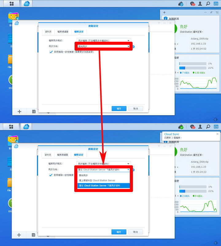 圖:另外在同步的權限設定方面,也可以更改預設的「雙向同步」,改為僅單向的上傳或下載。若是單純只是將舊機資料轉到新的DS916+,可選擇「僅從Cloud Station Server下載同步資料」。