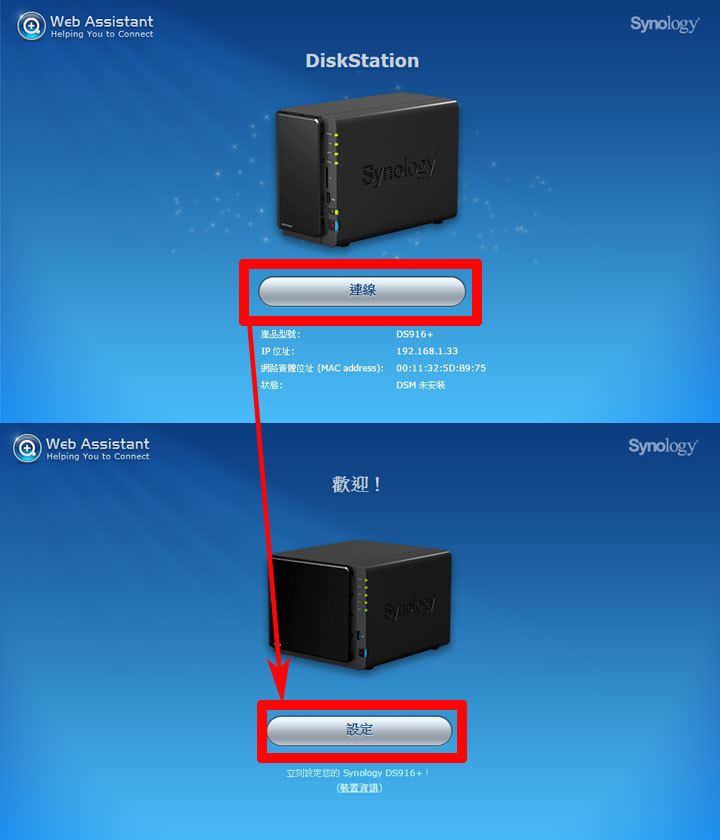 圖:在掃描後即可找到DS916+囉!點選「連線」並按下「設定」鈕,來進行初始設定。