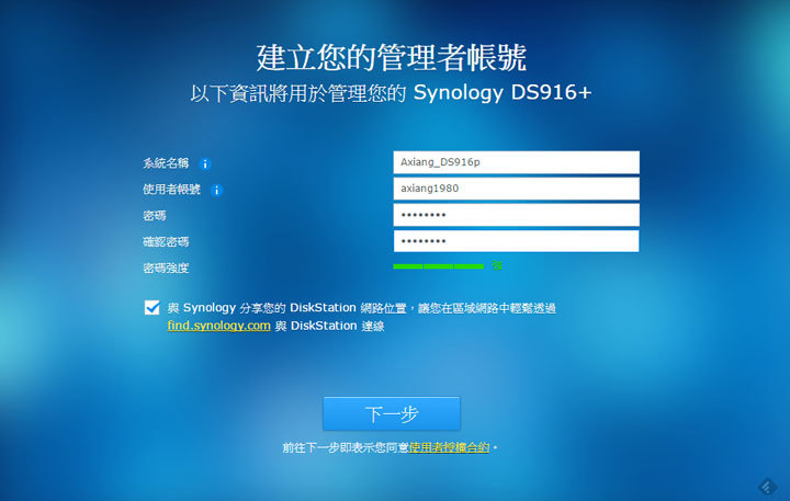 圖:接下來,我們可以進行DS916+系統的名稱編輯,以及使用者帳號密碼的設定,設定完成後,按下「下一步」。