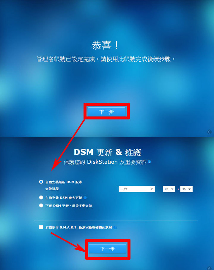 圖:如此一來就設定好管理者帳號囉,按「下一步」,來確認DSM系統更新與維護選項,建議維持預設的「自動安裝最新DSM版本」即可,接著再按「下一步」來確認。