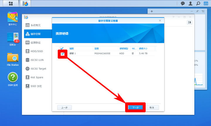 圖:接著勾選要建立的硬碟,目前我們在DS916+中只有一顆硬碟,因此預設就是選擇這顆,接著點選「下一步」。