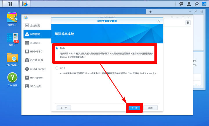 圖:接著在檔案系統的部份,建議可以選擇預設的Btrfs檔案系統,可以支援更多DSM的新功能。