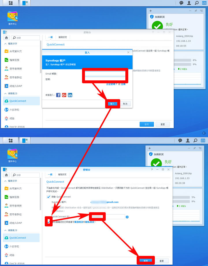 圖:若你已經有Synology帳戶,可直接登入帳號密碼,若沒有,就直接使用電子郵件註冊一個吧!在登入帳號後,接下來請勾選同意使用條款後,並自行設置一組英文或數字的「QuickConnect ID」,設置完成後,按下「確認」。