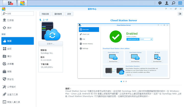 圖:透過「套件中心」,我們可以下載「Cloud Station」系列套件。