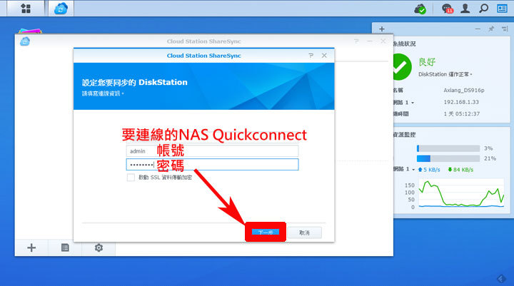 圖:安裝並啟動Cloud Station ShareSync後,請在設定畫面填入要連結的舊Synology NAS的QuickConnect、帳號與密碼,並按「下一步」。