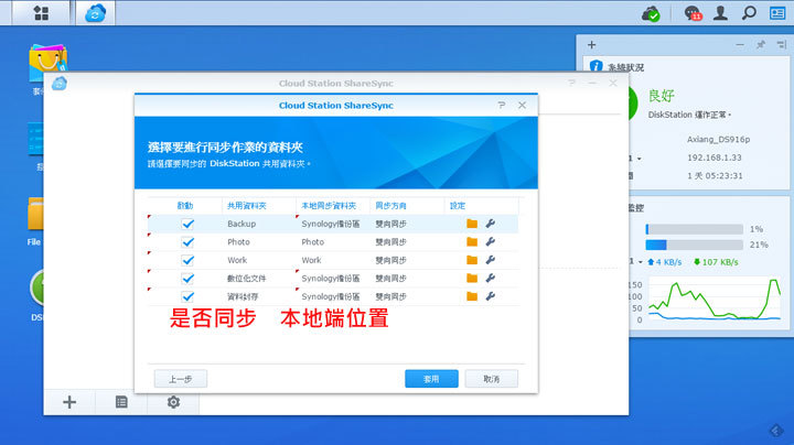 圖:接下來請選擇舊NAS中想要同步到DS916+的資料,並設定本地同步的資料夾(若不設定,系統會建立相同名稱的本地端資料夾)。
