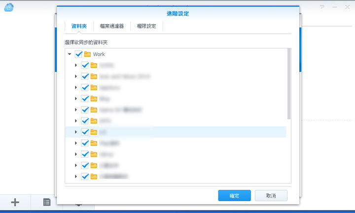 圖:另外我們也可以進一步設定要同步的共用資料夾中,哪些子資料夾是要被同步到DS916+中的。
