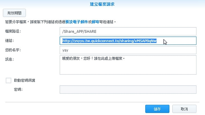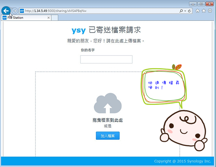 ▼透過這個連結點,你的朋友就可以快速上傳檔案到你的Synology伺服器上了。