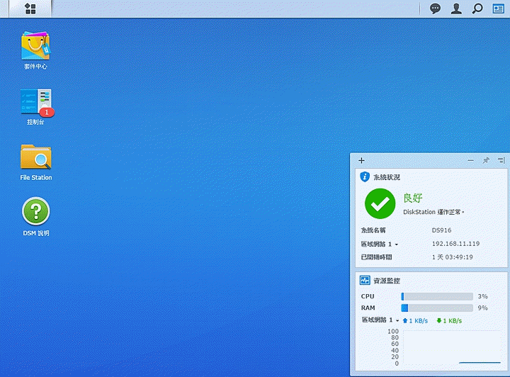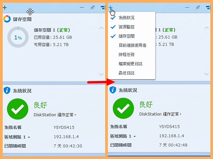 ▼至於,右下角則有小工具widget,讓使用者可以快速了解相關資訊,像是儲存空間、排程任務..等等,可依使用者需求,自行加入。