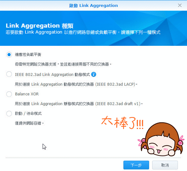 ▼在DS916+中,要啟動Link Aggregation很簡單,點選"新增",就可以成功啟動Link Aggregation,只不過想要發揮Link Aggregation最大效能,還需要有支援Link Aggregation的Switch HUB才行。