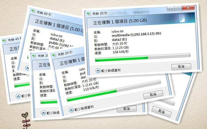 ▼由於測試方法簡單,只透過WINDOWS 網路硬碟方式傳檔(SMB網路硬碟分享)方式來抓最佳成績,所以只供參考。