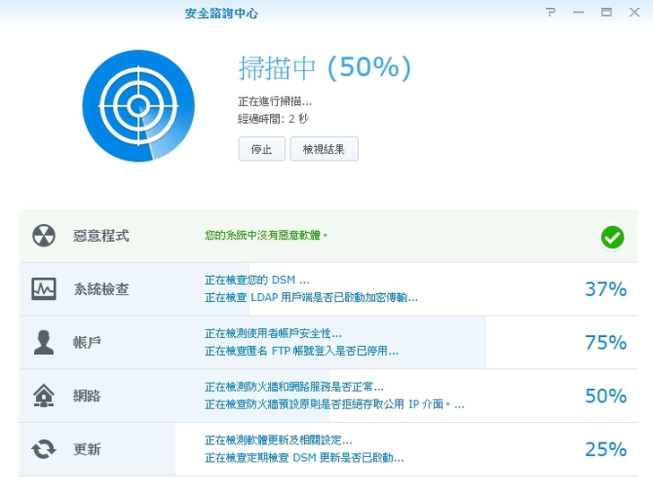 在DSM 6.0中,針對系統安全上,除了上一節看到的二步驟認證安全外,DSM 6.0還提供安全的好幫手-安全諮詢中心,它可以掃描你NAS系統裡面的設定是否暴露在安全風險中,像是使用者密碼強度、網路設定、惡意程式..等,讓你即時了解的NAS系統安全。
