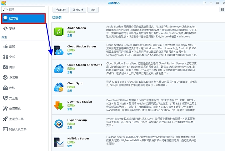 ▼在套件中心的已安裝選項上,可以清楚看到目前系統上已安裝的套件轉體,方便使用者了解控管。