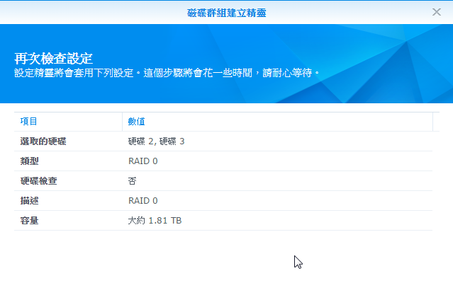 ▼接下來NAS就會開始建立Btrfs檔案系統,需要些許時間來建立,要耐心等待一下。