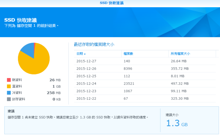 ▼在DSM 6.0中,還有個貼心功能,系統提供"SSD快取建議"精靈,分析你目前硬碟狀態,提供建議快取SSD所需的空間大小,實在很方便。