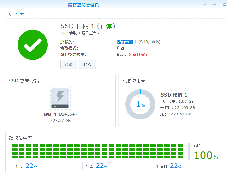 ▼裝上SSD,針對大量頻繁的資料讀取,絕對會有效能的提升,透過DSM 6.0內建的統計分析圖,你可以了解SSD快取的效能,就筆者體驗經驗來看,SSD的確能增加讀取速度,對企業、公司大大量頻繁的資料讀取,絕對能增進傳輸效能。