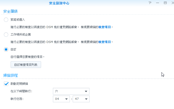 ▼安全諮詢中心,可以設定排程進行掃描,也可以自訂安全掃描的內容選項。