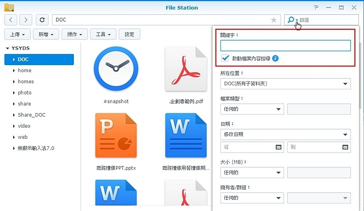 ▼新版本的File Station(就是檔案總管功能),不僅全面優化並整合至 DSM 6.0 中,同時在搜尋方面更多了全內文搜尋功能,而且新版本的File Station 的搜尋引擎能辨識超過 700 種檔案格式,囊括所有最常見的檔案格式。