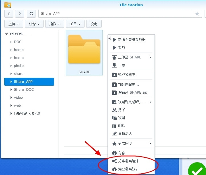 ▼在DSM 6.0中,只需要輕點分享檔案連結,你不必費力去建立使用者帳號,就能快速產生檔案連結分享。