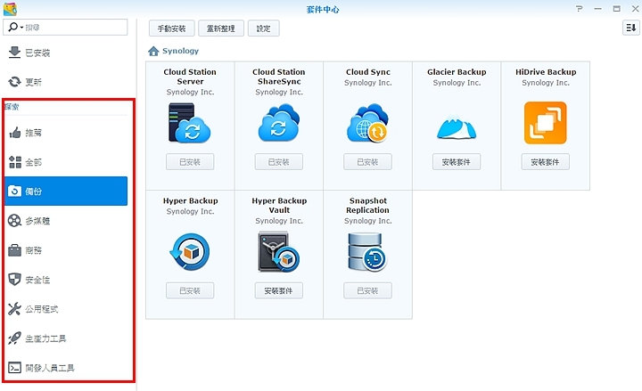 Synonlgy提供非常豐富的套件,從備份功能、防毒軟體到各式伺服器功能的軟體都有,打造一個完整豐富的NAS使用環境,這也是為甚麼Synology備受使用者推崇的原因之一。