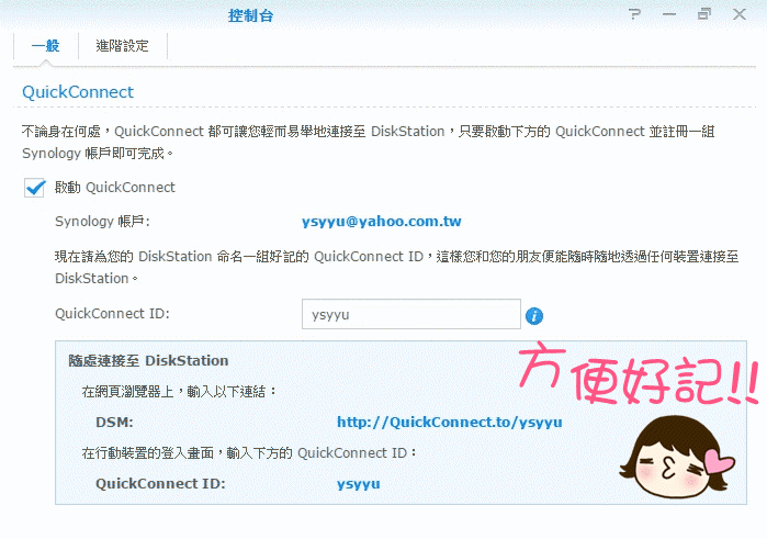 ▼這是筆者申請的Synology帳戶跟QuickConnect ID,只要在Synology軟體上看到可以輸入QuickConnect ID連結時,我只要輸入所申請的QuickConnect ID,不用背記無意義的IP數字,只要能上網就能馬上連接到我的DS916+了。