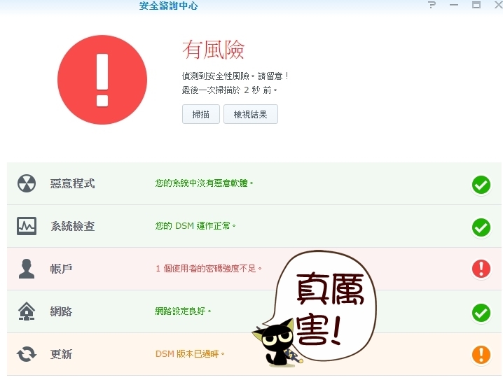 ▼安全諮詢中心-是你NAS最好的安全顧問,針對你的系統給你最好的安全建議,像是筆者密碼設定過於簡單,它也會發出警告。