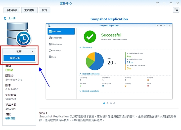 ▼同時,要注意的事,在DSM裡面並沒有專門移除軟體的功能,一但想要移除的不要的套件軟體,則只要點開該套件軟體,在點選動作裡的面解除安裝就可以了。