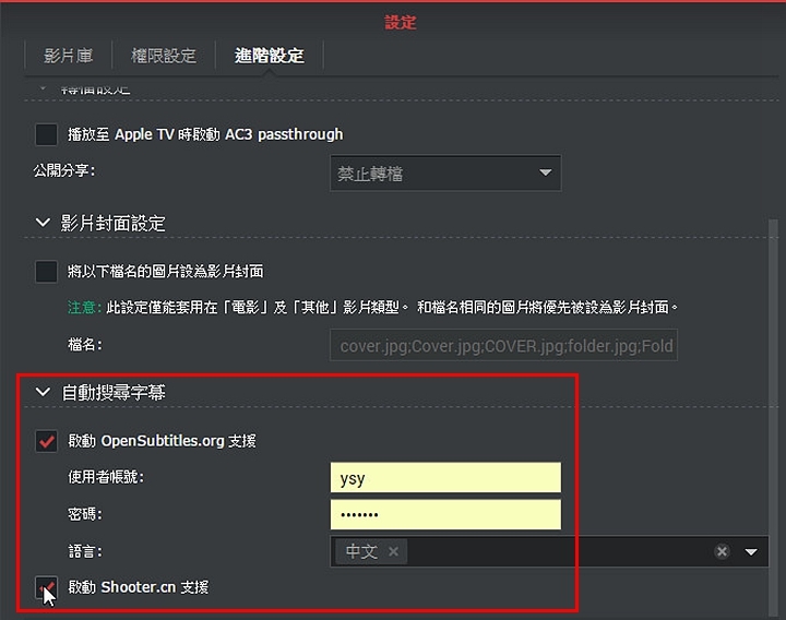 ▼不過在設定中,筆者發現一個相當貼心實用的設定,就是 Video Station能自動幫你搜尋下載影片的字幕檔,像是熱門的射手網,讓你看洋片時,不用擔心看不懂了,這個實在太實用了。