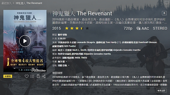 ▼而且資訊十分詳細有用,像是電影類型、片長、演員,上映時間、甚至情節摘要等,條列的一清二楚,對喜歡電影的人來說,真的是十分好用。