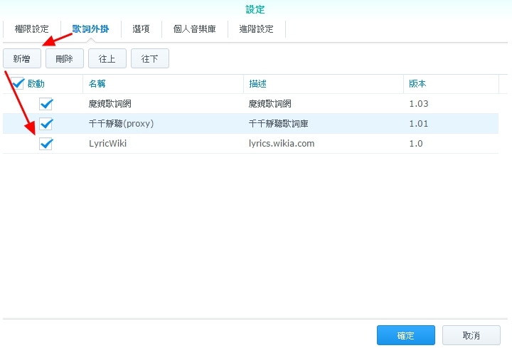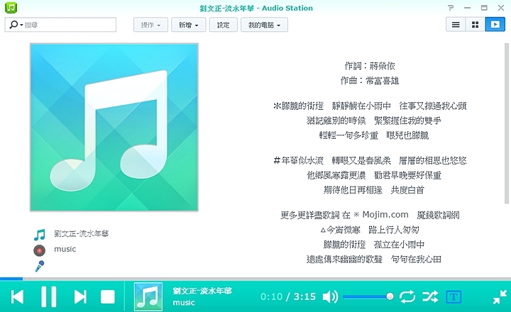 ▼ AudioStation 有一個貼心的功能,就是能夠自行下載到相關的歌詞,在播放時或是 DS Audio 在播放歌曲時可以顯示動態歌詞。原本AudioStation只有一個lyricwiki一個伺服器,而且還有版權限制問題,所以台灣使用者必須要自行添加歌詞伺服器像是魔鏡歌詞網,這樣就可以下載到最新的歌詞了。