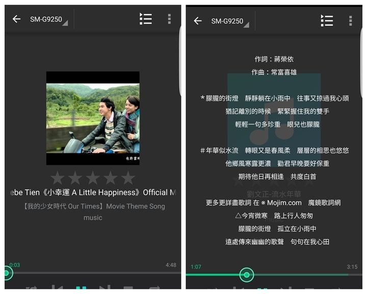 ▼歌曲播放的介面很好操作,點選播放後,就可以撥放音樂了,同時也能自動上網下載相對應的歌詞,十分的方便好用。