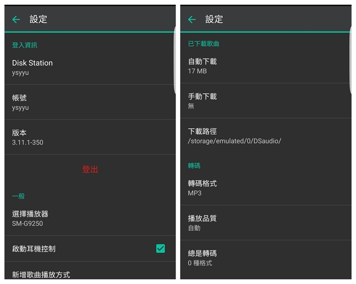 ▼在設定的功能表,裡面可以調整下載路徑、音樂轉碼格式、音質、音效等等功能。