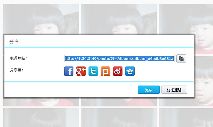 ▼一樣點選分享,系統也會產生一組專屬的網址,跟上面分享方式一樣,只要將這個網址告訴朋友就可以連結道你要分享的相片了。
