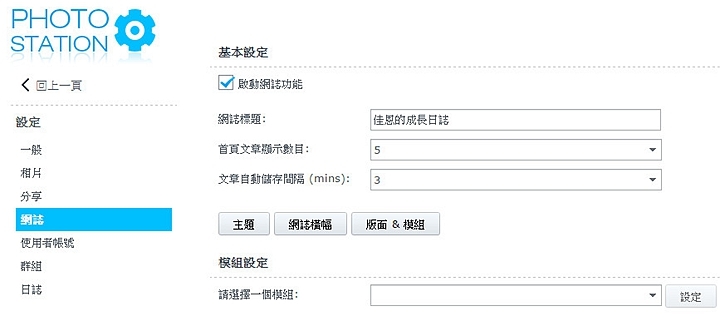▼在Photo Station設定中,你可以點選啟動網誌功能,打上你要的主題,按下確定就可以。