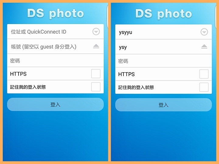 ▼自GOGLE play商店或APPLE Store下載DS PHOTO軟體後,以下就是一開始的登錄畫面,還記的之前申請過的QuickConnect ID?這時後就派上用場了,只要填上 QuickConnect ID,不用再記憶複雜的網址,馬上就可以連線到你的DS415+。